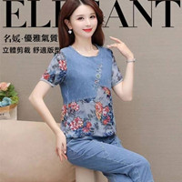 新款水洗牛仔套裝 寬鬆剪裁 修飾身形更顯瘦 七分褲高腰設計 顯高顯腿長