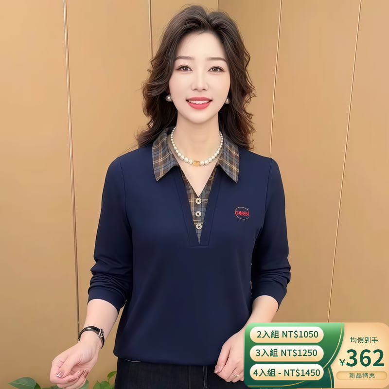 【休閒格紋寛鬆長袖】2025新款翻領假兩件寛鬆長袖 氣質減齡顯瘦 媽媽裝T恤休閒上衣 面料柔軟舒適 百搭顯氣質